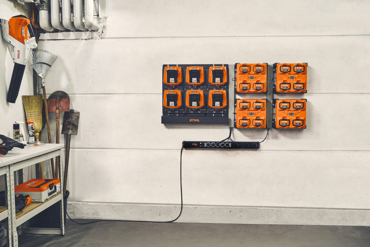 Le contrôleur de charge STIHL CM 10 est la solution idéale pour les professionnels de l'aménagement des jardins, les collectivités et les entreprises forestières qui recherchent une gestion efficace de leur parc de batteries. Il permet de connecter jusqu'à 10 chargeurs et de charger jusqu'à 40 batteries à partir d'un seul fusible, que ce soit à l'atelier ou en déplacement, par exemple dans un véhicule associé à une solution mobile.